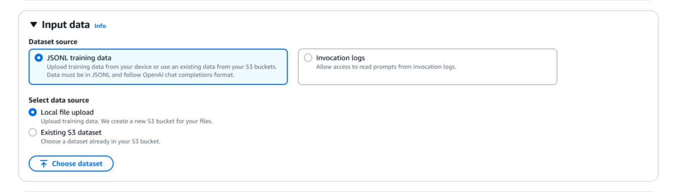 Next, I need to provide training data. I can use my stored invocation logs directly, eliminating the need to upload separate datasets. I can also upload new JSONL files or select existing datasets from Amazon Simple Storage Service (Amazon S3). Reinforcement fine-tuning automatically validates my training dataset and supports the OpenAI Chat Completions data format. If I provide invocation logs in the Amazon Bedrock invoke or converse format, Amazon Bedrock automatically converts them to the Chat Completions format.