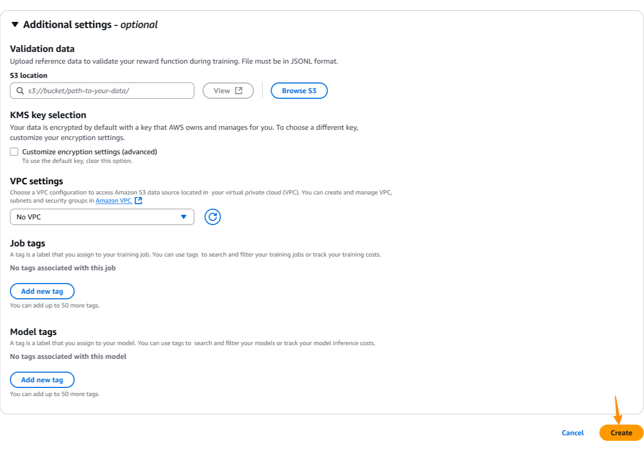 For enhanced security, I can configure virtual private cloud (VPC) settings and AWS Key Management Service (AWS KMS) encryption to meet my organization’s compliance requirements. Then, I choose Create to start the model customization job.