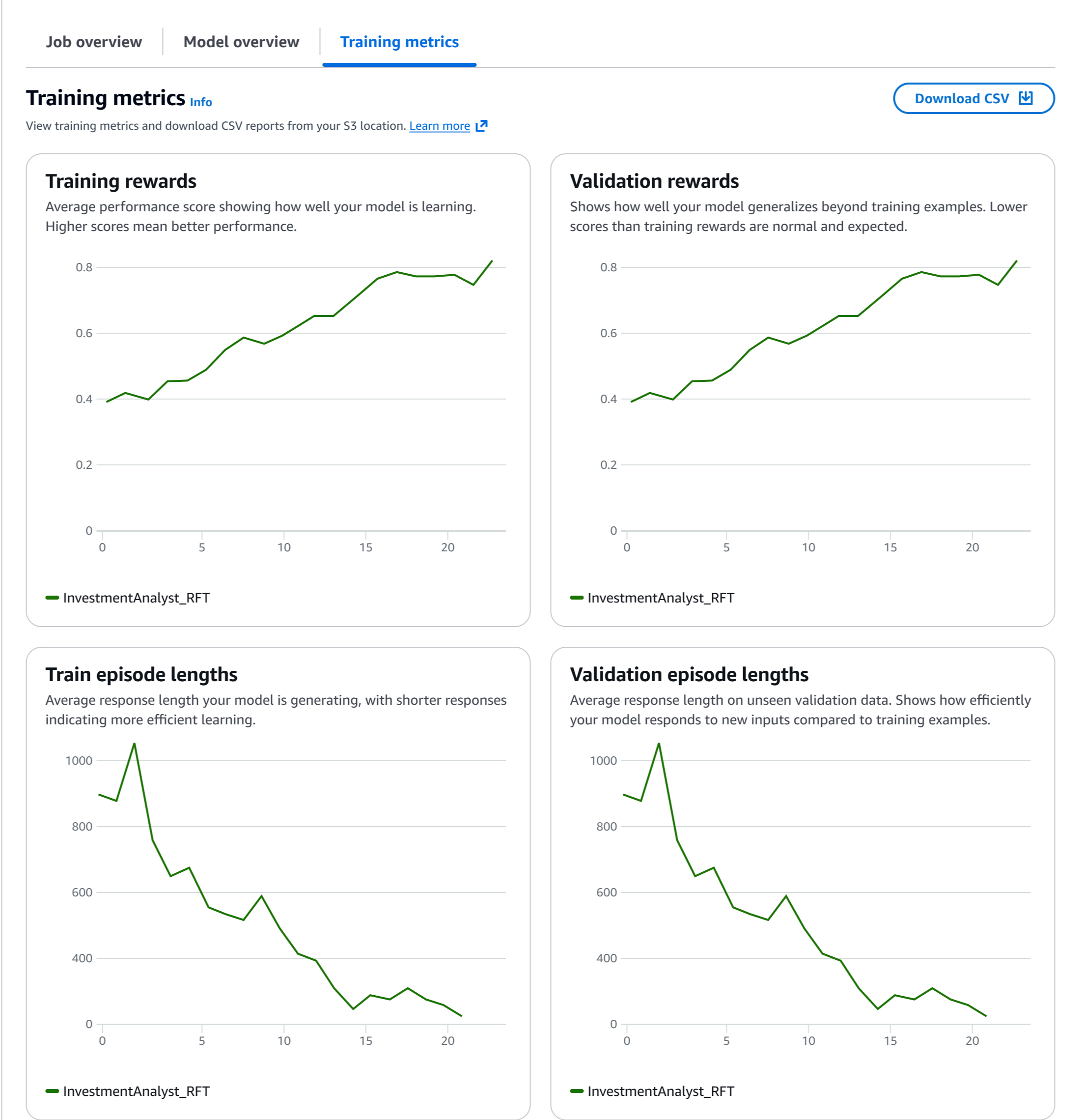 During the training process, I can monitor real-time metrics to understand how the model is learning. The training metrics dashboard shows key performance indicators including reward scores, loss curves, and accuracy improvements over time. These metrics help me understand whether the model is converging properly and if the reward function is effectively guiding the learning process.