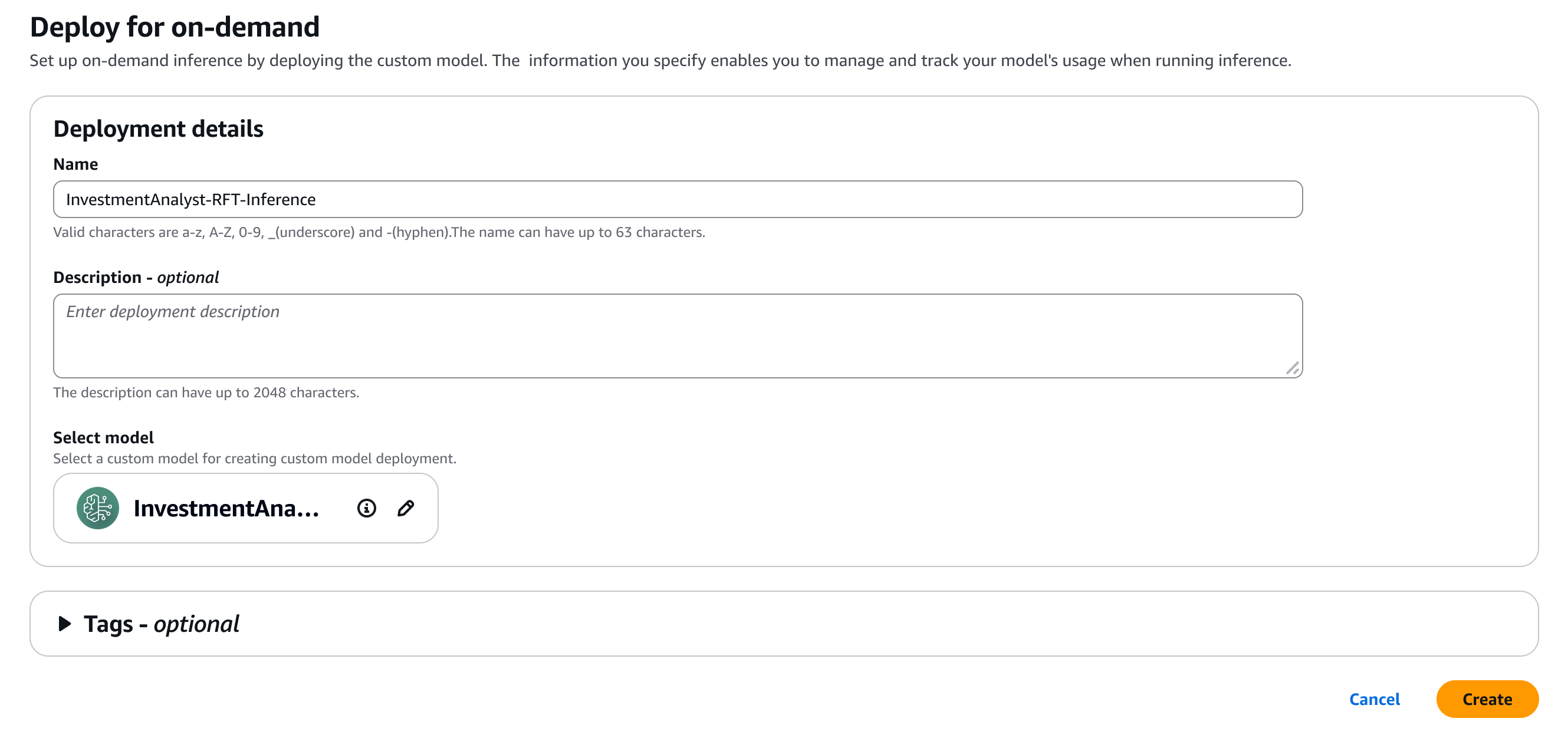 Once the job is completed, I can deploy the model with a single click. I select Set up inference, then choose Deploy for on-demand.