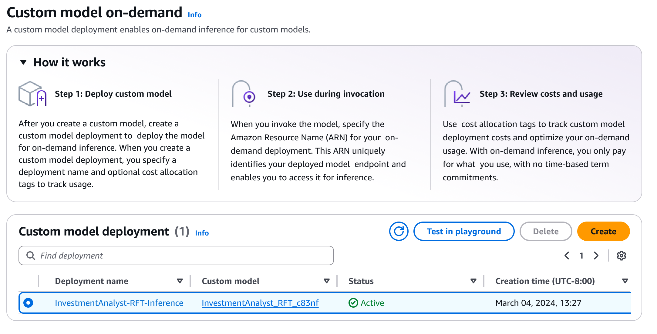 After deployment, I can quickly evaluate the model’s performance using the Amazon Bedrock playground. This helps me to test the fine-tuned model with sample prompts and compare its responses against the base model to validate the improvements. I select Test in playground.