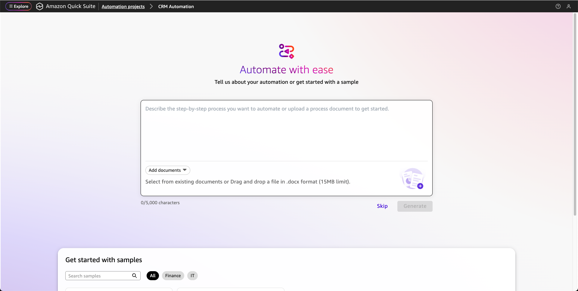 Quick Automate helps technical teams build and deploy sophisticated automation for complex, multistep processes that span departments, systems, and third-party integrations. Using AI-powered natural language processing, Quick Automate transforms complex business processes into multi-agent workflows that can be created merely by describing what you want to automate or uploading process documentation.