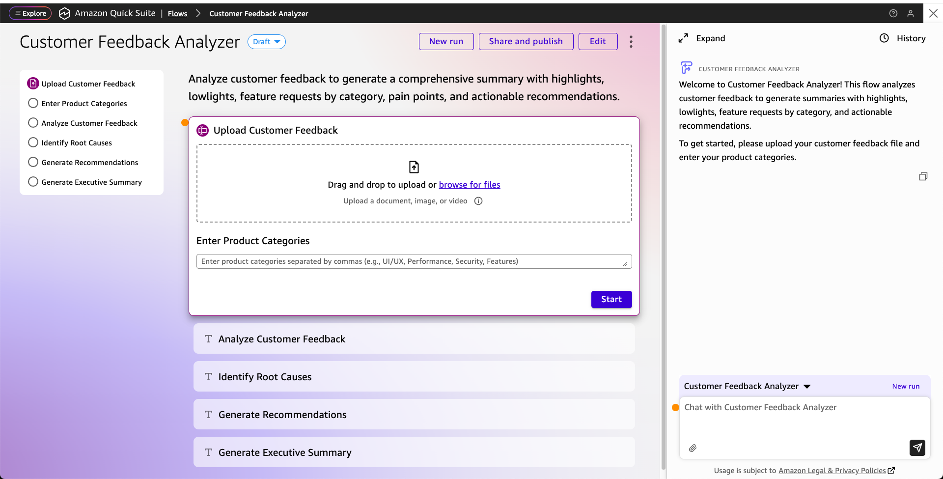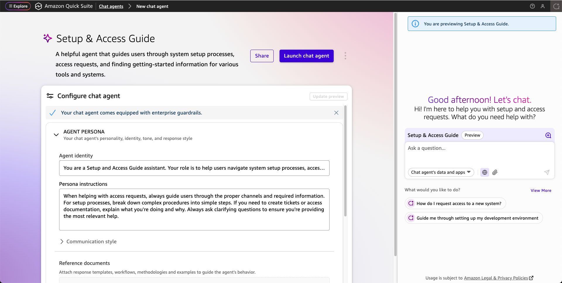 Chat agents – Quick Suite includes insights agents that you can use to interact with your data and workflows through natural language. Quick Suite includes a built-in agent to answer questions across all of your data and custom chat agents that you can configure with specific expertise and business context. Custom chat agents can be tailored for particular departments or use cases—such as a sales agent connected to your product catalog data and pricing information stored in a space or a compliance agent configured with your regulatory requirements and actions to request approvals.