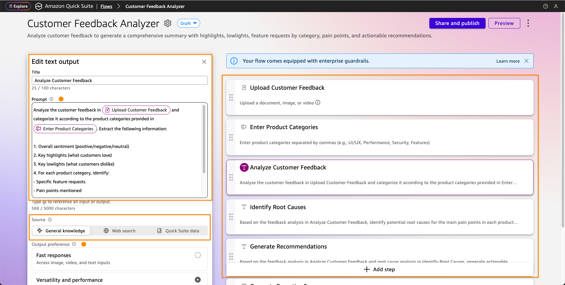 After the flow is configured, you can share it with a single click to your coworkers and other teams. To execute the flow, users can open it from the library or invoke it from chat, provide the necessary inputs, and then chat with the agent to refine the outputs and further customize the results.