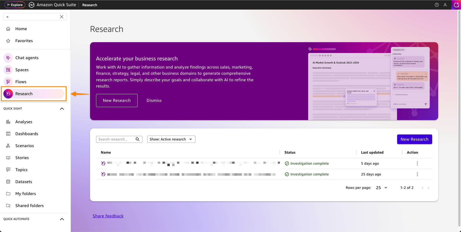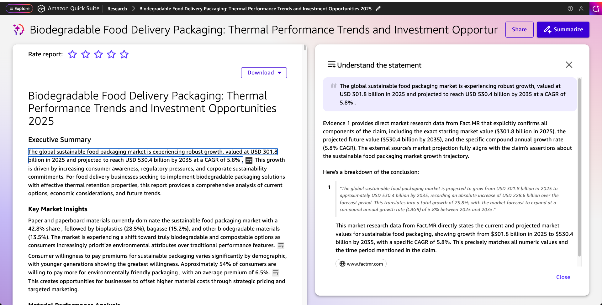 Quick Research integrates with your enterprise data connected to Quick Suite, the unified knowledge foundation that connects to your dashboards, documents, databases, and external sources, including Amazon S3, Snowflake, Google Drive, and Microsoft SharePoint. Quick Research grounds key insights to original sources and reveals clear reasoning paths, helping you verify accuracy, understand the logic behind recommendations, and present findings with confidence. You can trace findings back to their original sources and validate conclusions through source citations. This makes it ideal for complex topics requiring in-depth analysis.