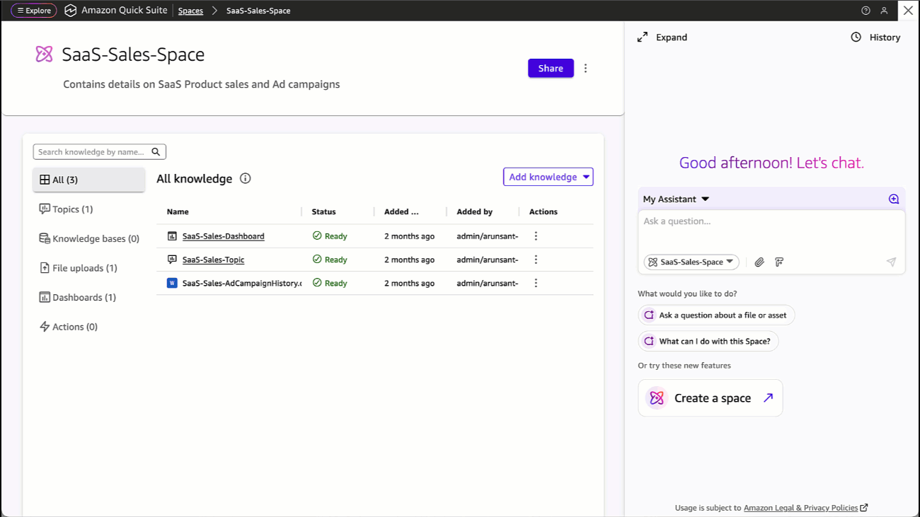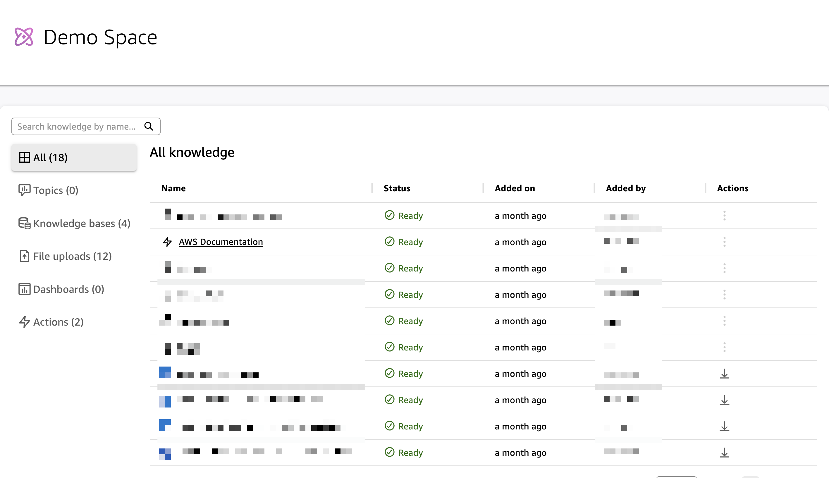 Spaces – Spaces provide a straightforward way for every business user to add their own context by uploading files or connecting to specific datasets and repositories specific to their work or to a particular function. For example, you might create a space for quarterly planning that includes budget spreadsheets, market research reports, and strategic planning documents. Or you could set up a product launch space that connects to your project management system and customer feedback databases. Spaces can scale from personal use to enterprise-wide deployment while maintaining access permissions and seamless integration with Quick Suite capabilities.