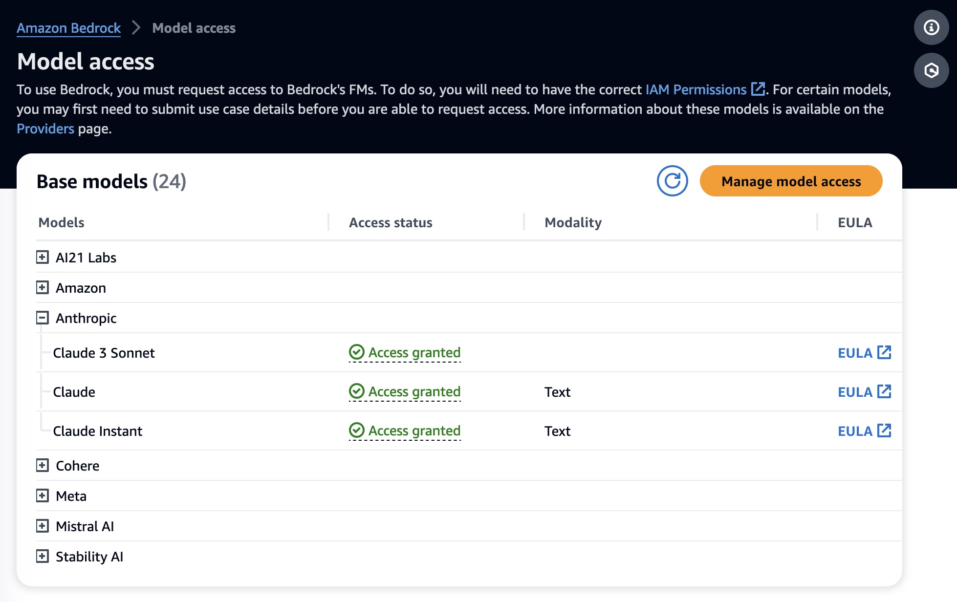 If you are new to using Anthropic models, go to the Amazon Bedrock console and choose Model access on the bottom left pane. Request access separately for Claude 3 Sonnet.