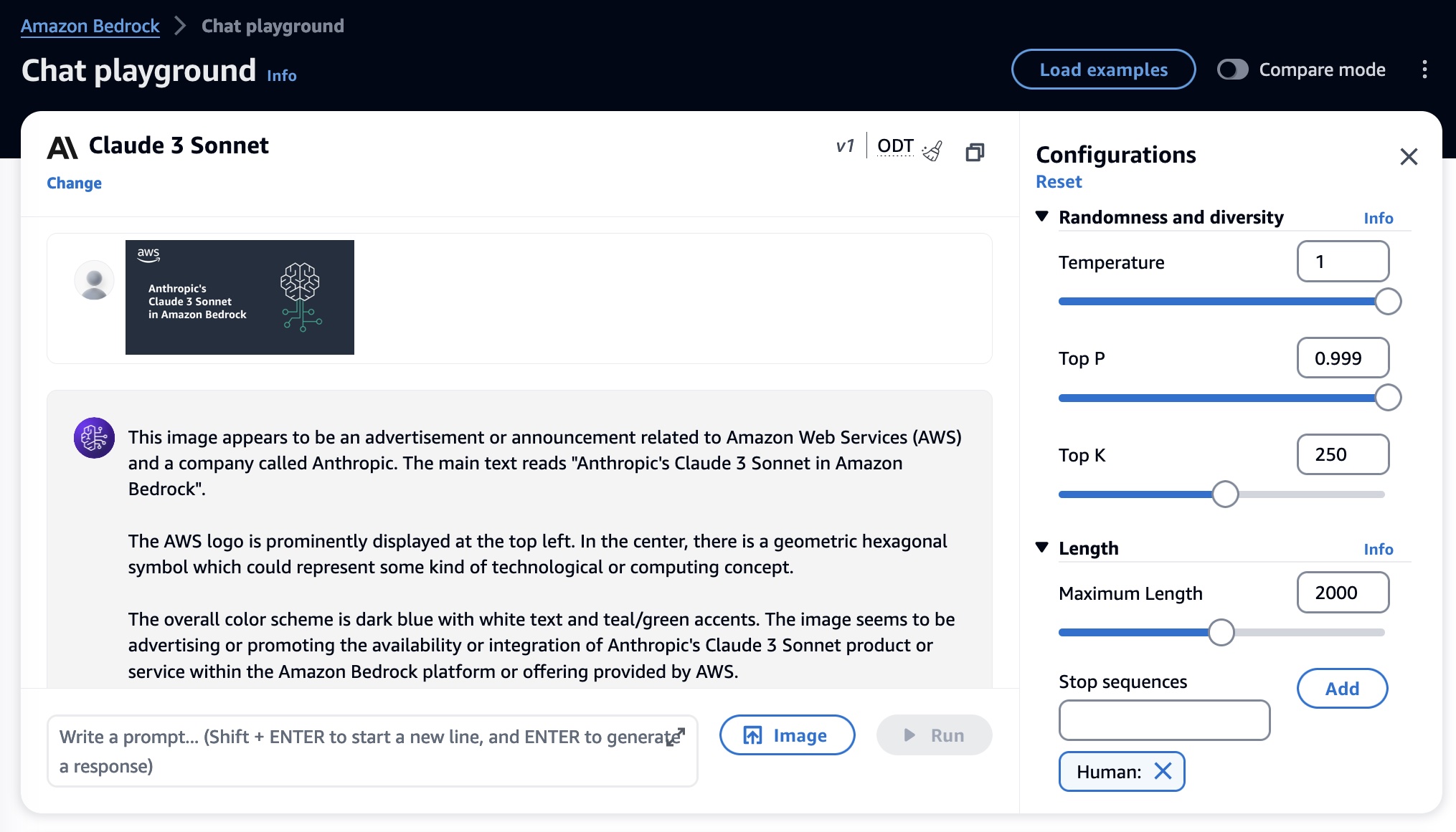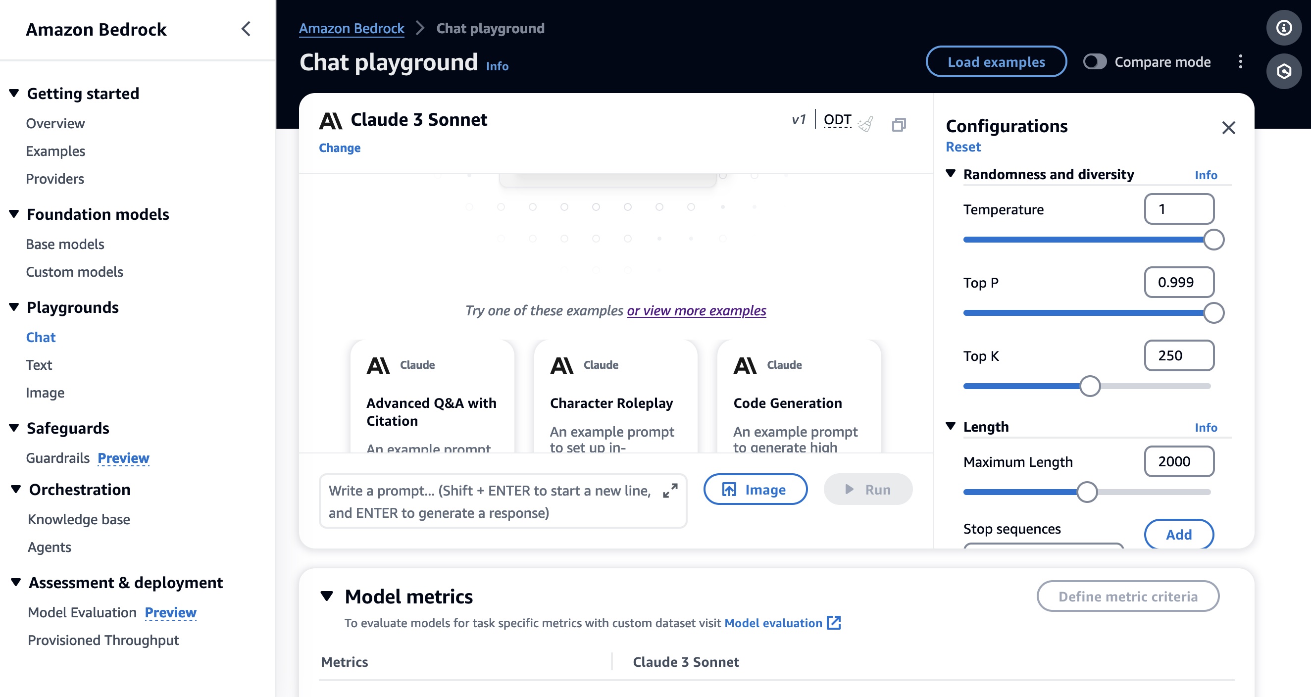 To test more Claude prompt examples, choose Load examples. You can view and run Claude 3 specific examples, such as advanced Q&A with citations, crafting a design brief, and non-English content generation.