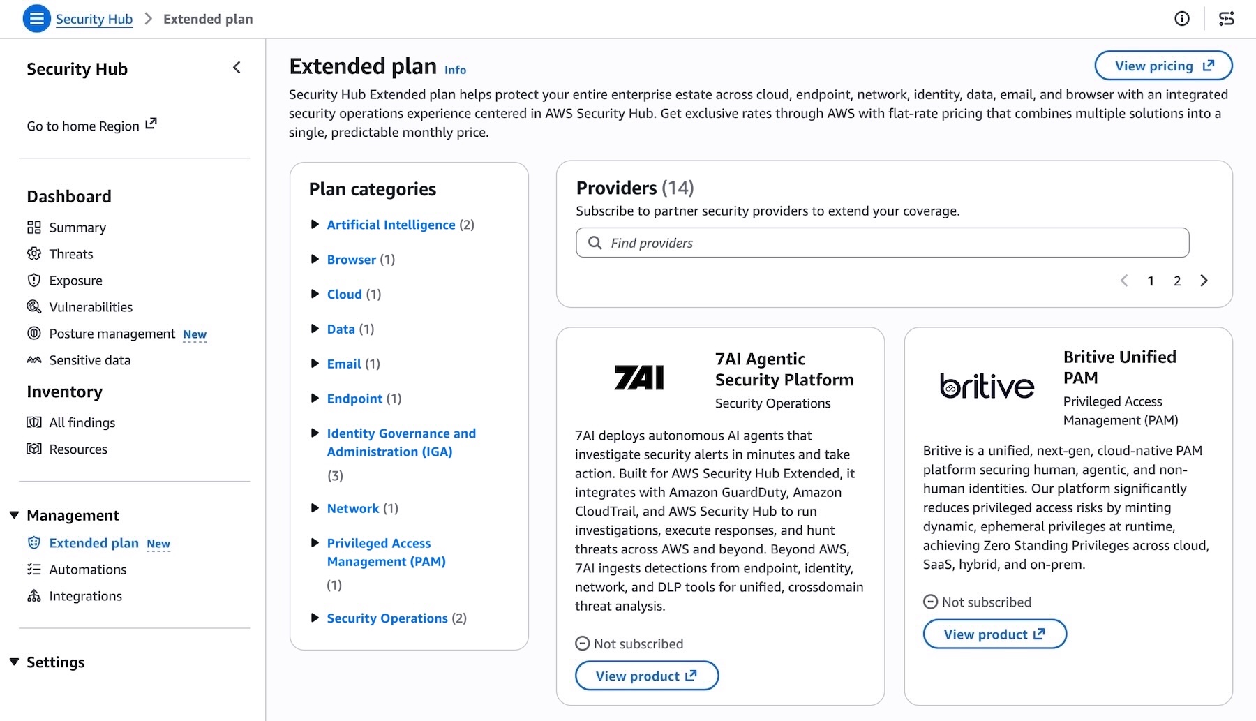 Today, we’re announcing AWS Security Hub Extended, a plan of Security Hub that simplifies how you procure, deploy, and integrate a full-stack enterprise security solution across endpoint, identity, email, network, data, browser, cloud, AI, and security operations. With the Extended plan, you can expand your security portfolio beyond AWS to help protect your enterprise estate through a curated selection of AWS Partner solutions, including 7AI, Britive, CrowdStrike, Cyera, Island, Noma, Okta, Oligo, Opti, Proofpoint, SailPoint, Splunk, a Cisco company, Upwind, and Zscaler.