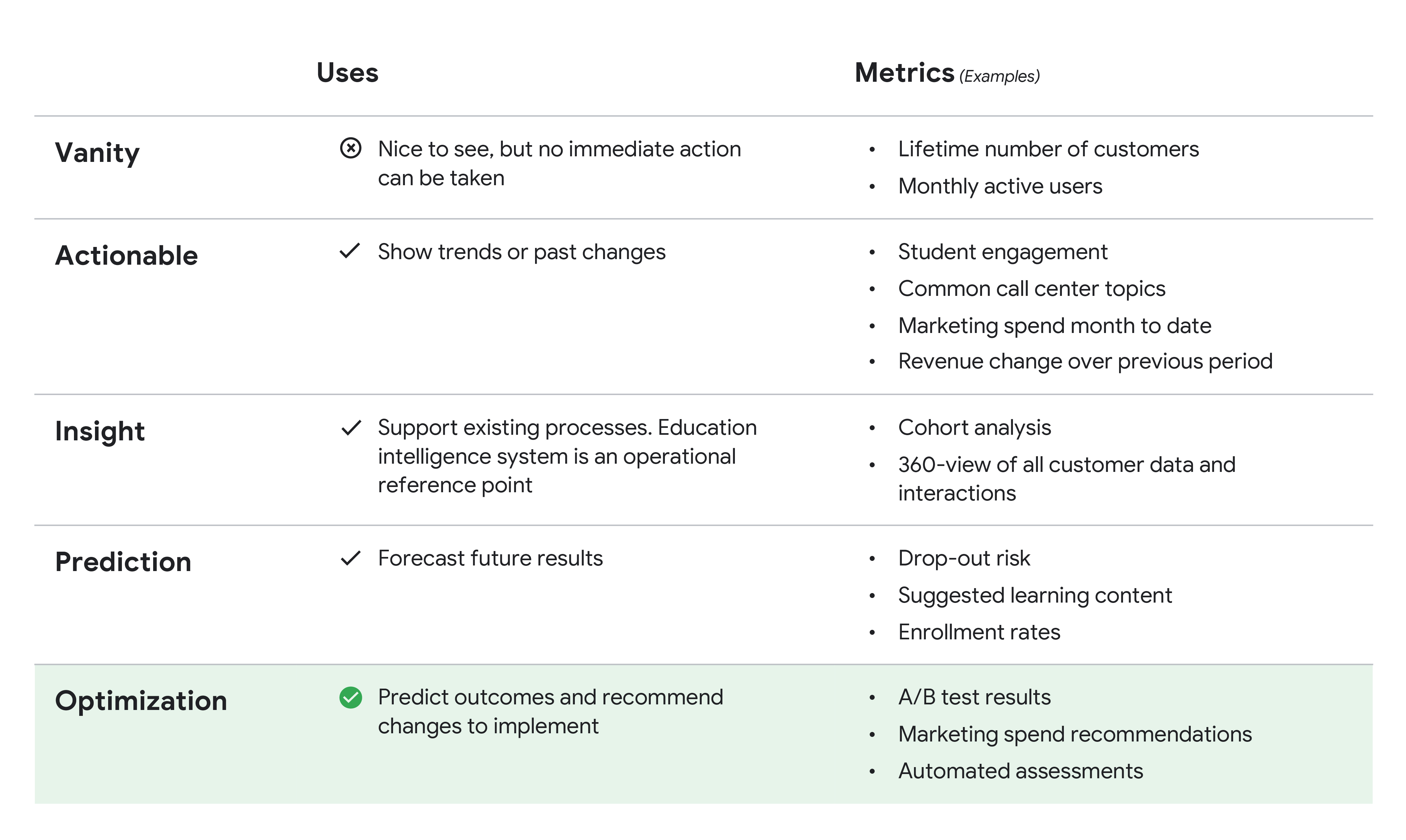 How well is your company using analytics? The matrix from Looker’s Analytical Maturity eBook, shows ranges from “vanity” (nice to see) metrics to “optimization.”