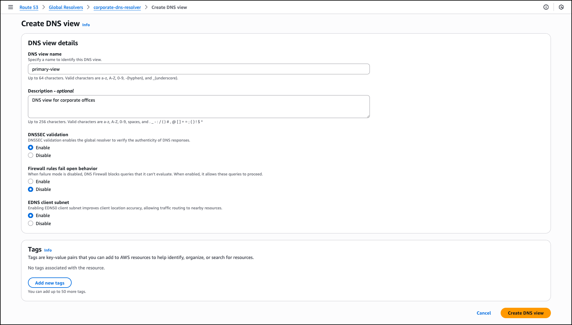 For DNSSEC validation, choose Enable to verify the authenticity of DNS responses from public DNS servers. For Firewall rules fail open behavior, choose Disable to block DNS queries when firewall rules can’t be evaluated, which provides additional security. For EDNS client subnet, keep Enable selected to forward client location information to DNS servers, which allows content delivery networks to provide more accurate geographic responses. DNS view creation might take a few minutes to become operational.