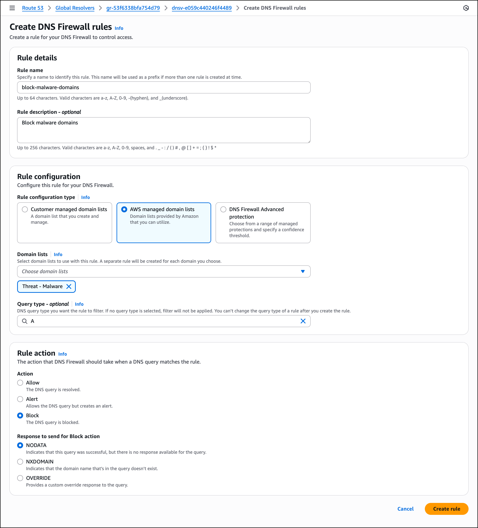 For this walkthrough, choose AWS managed domain lists. In the Domain lists dropdown, choose one or more AWS managed lists such as Threat – Malware to block known malicious domains. You can leave Query type empty to apply the rule to all DNS query types. In this example, choose A to apply this rule only to IPv4 address queries. In the Rule action section, select Block to prevent DNS resolution for domains that match the selected lists. For Response to send for Block action, keep NODATA selected to indicate that the query was successful but no response is available, then choose Create rules.