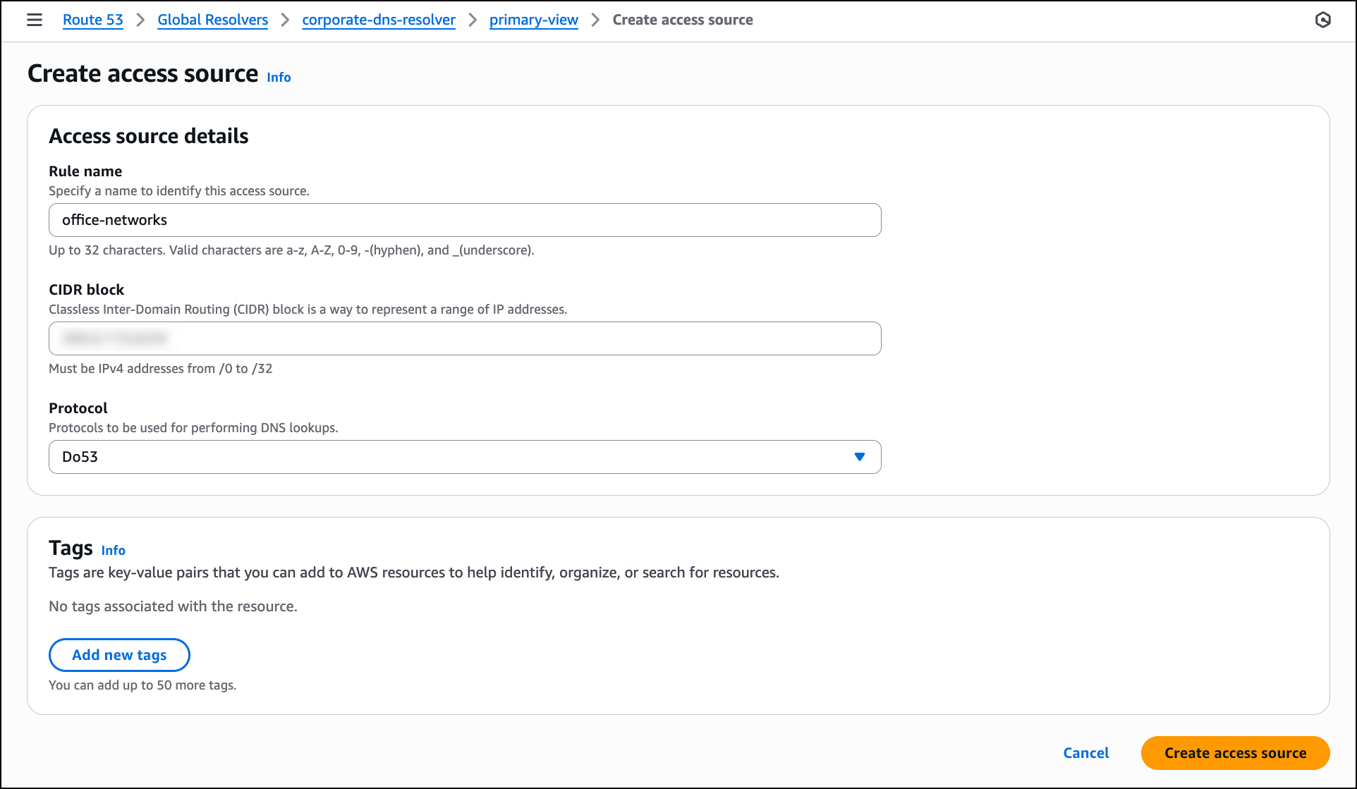 In the Access source details section, enter a Rule name such as office-networks to identify the access source. In the CIDR block field, enter the IP address range for your offices to allow queries from that network. For Protocol, select Do53 for standard DNS queries over UDP or choose DoH or DoT if you want to require encrypted DNS connections from clients. After configuring these settings, choose Create access source to allow the specified network to send DNS queries to the resolver.
