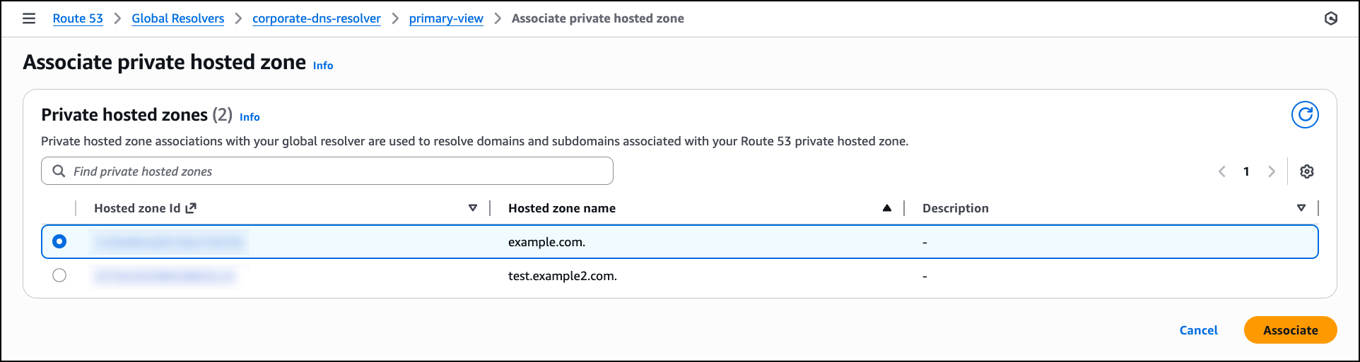 After the access token is created, navigate to the Private hosted zones tab in the DNS view to associate Route 53 private hosted zones with the DNS view so that the resolver can resolve queries for your private application domains. Choose Associate private hosted zone and in the Private hosted zones section, select a private hosted zone from the list that you want the resolver to handle. After selecting the zone, choose Associate to enable the resolver to respond to DNS queries for these private domains from your configured access sources.