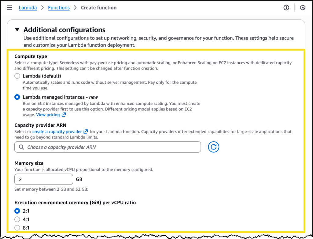 After I have my capacity provider configured, I can choose it through its Amazon Resource Name (ARN) when I go to create a new Lambda function. Here I can also select the memory allocation I want along with a memory-to-vCPU ratio.