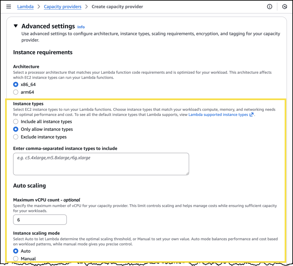 When creating a capacity provider, you can choose from the latest generation of EC2 instances to match your workload requirements. For cost-optimized general-purpose compute, you could choose AWS Graviton4 based instances that deliver excellent price performance. If you’re not sure which instance type to select, AWS Lambda provides optimized defaults that balance performance and cost based on your function configuration.