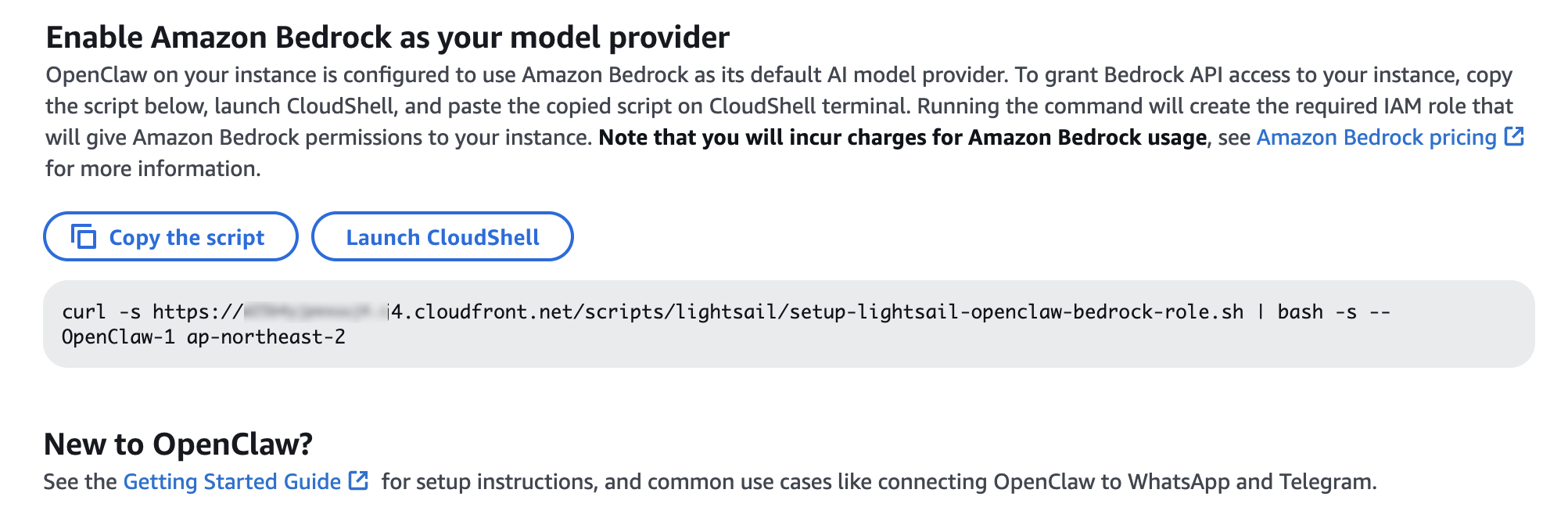 Your OpenClaw instance on Lightsail is configured to use Amazon Bedrock to power its AI assistant. To enable Bedrock API access, copy the script in the Getting started tab and run copied script into the AWS CloudShell terminal.