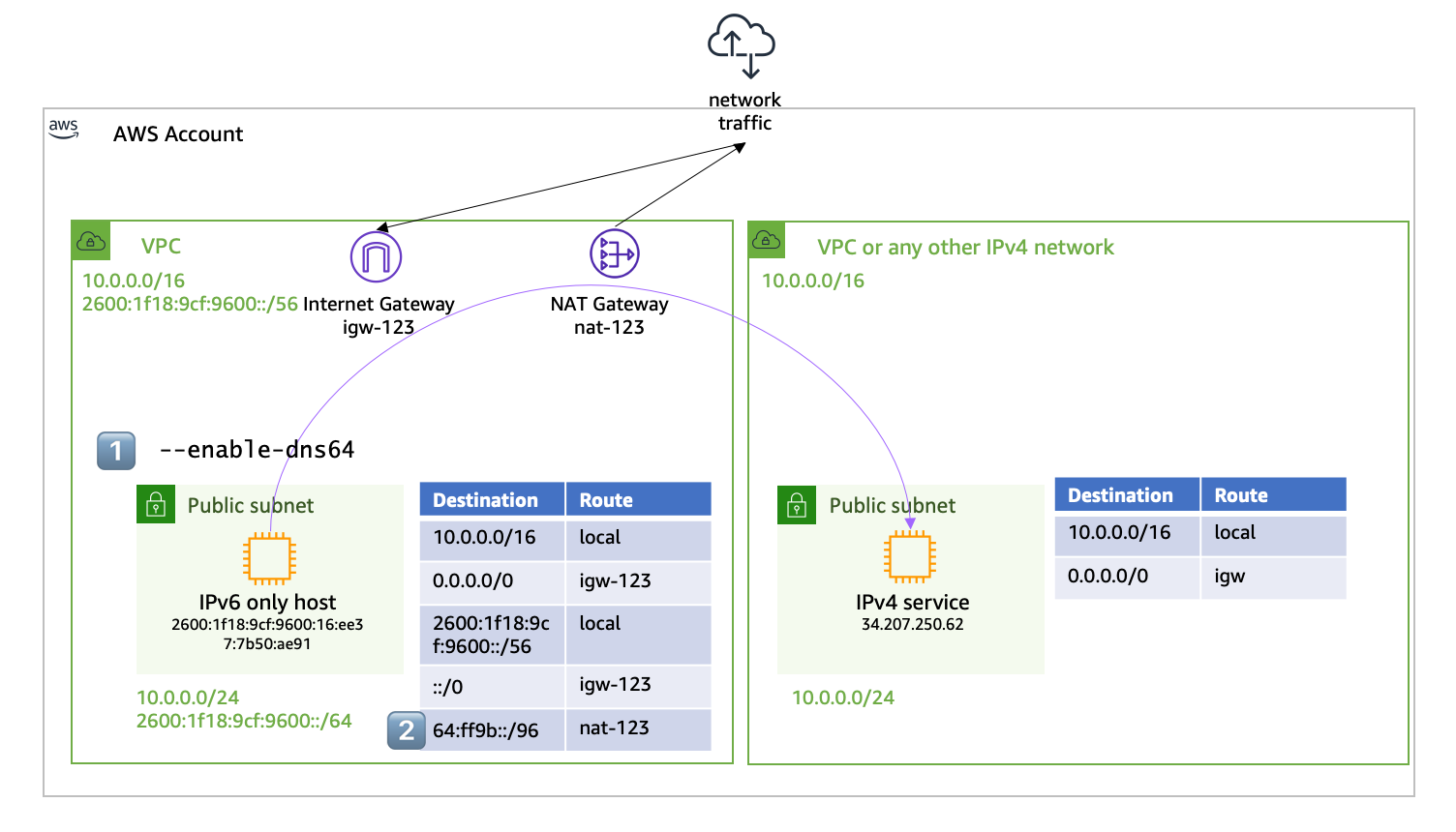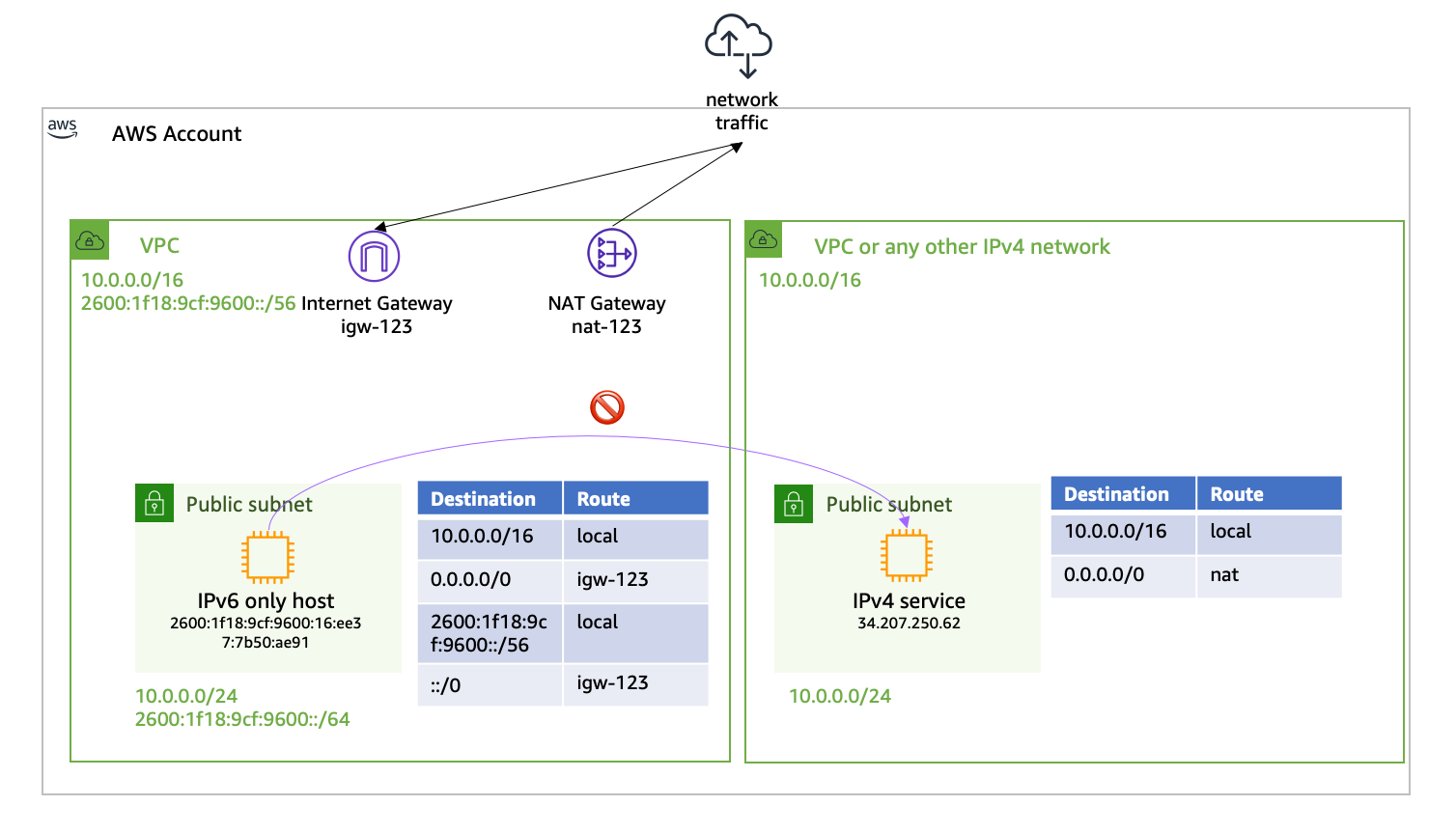 With these two simple changes, my IPv6-only workloads in the subnet may now communicate with IPv4 services. The IPv4 service might live in the same VPC, in another VPC, or anywhere on the internet.
