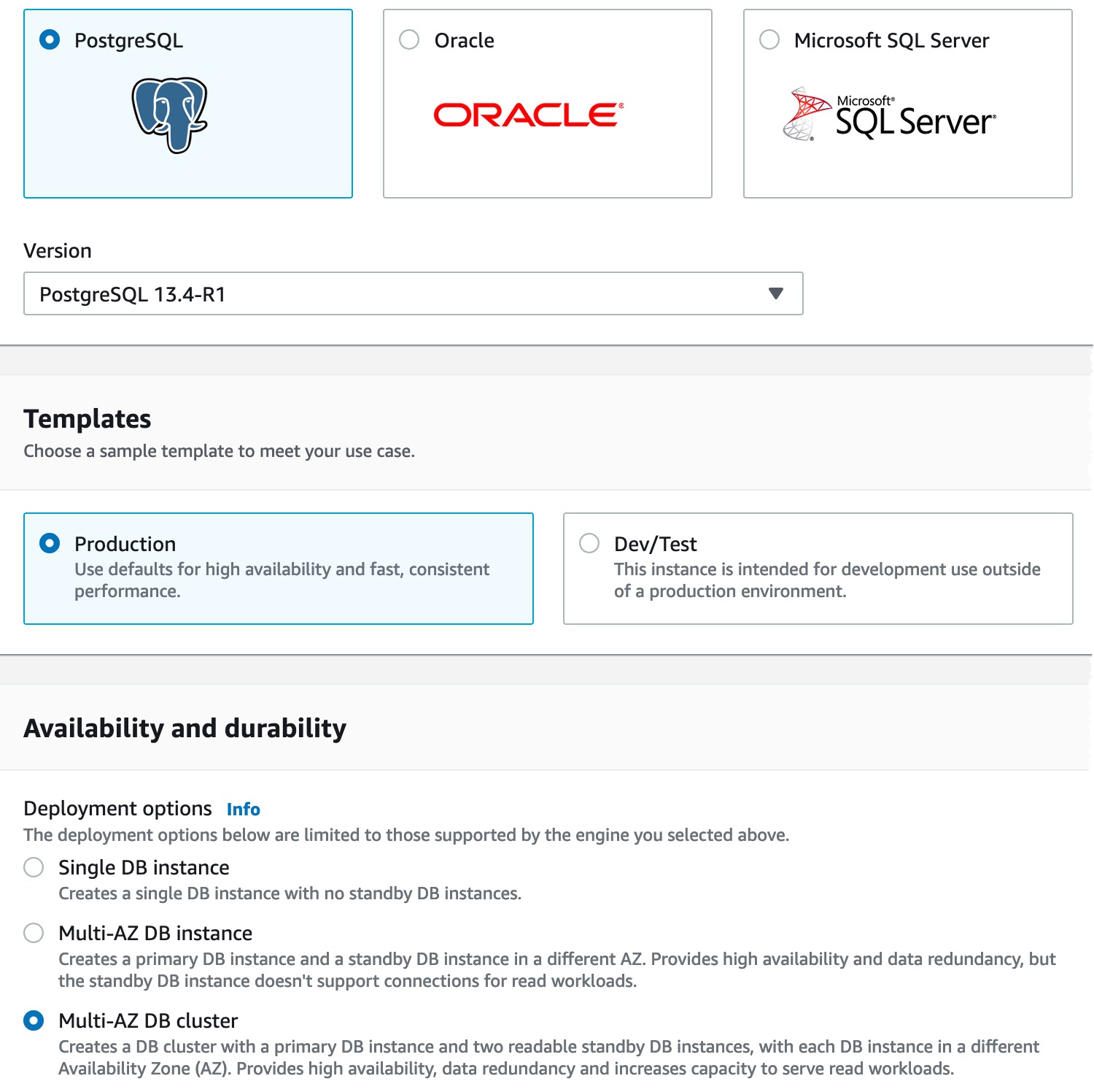 Under Deployment options, I select PostgreSQL, version 13.4 R1, and under Availability and Durability, I select Multi-AZ DB cluster.