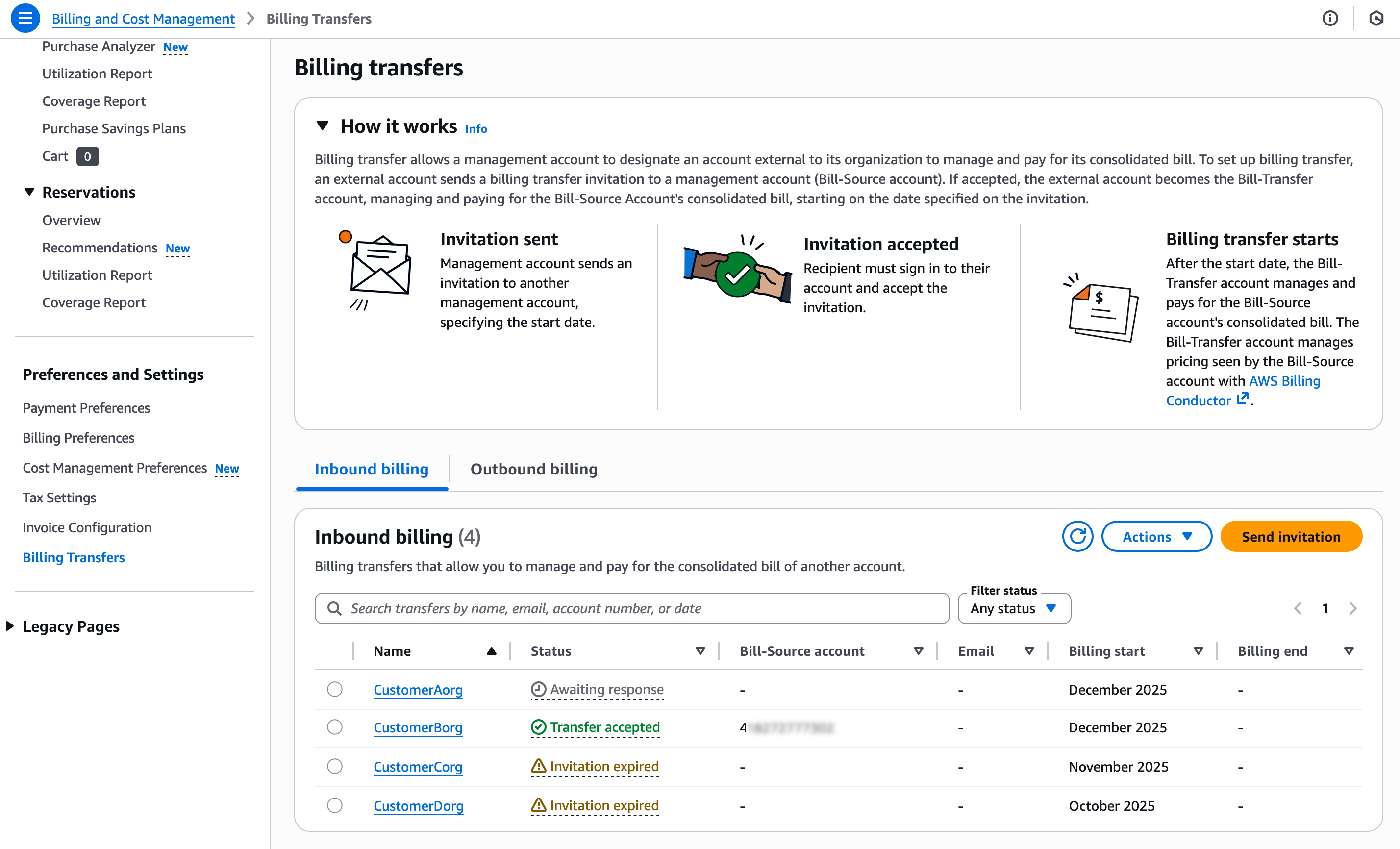 When you choose Send invitation, the bill-source accounts will get a billing transfer notice in the Outbound billing tab.