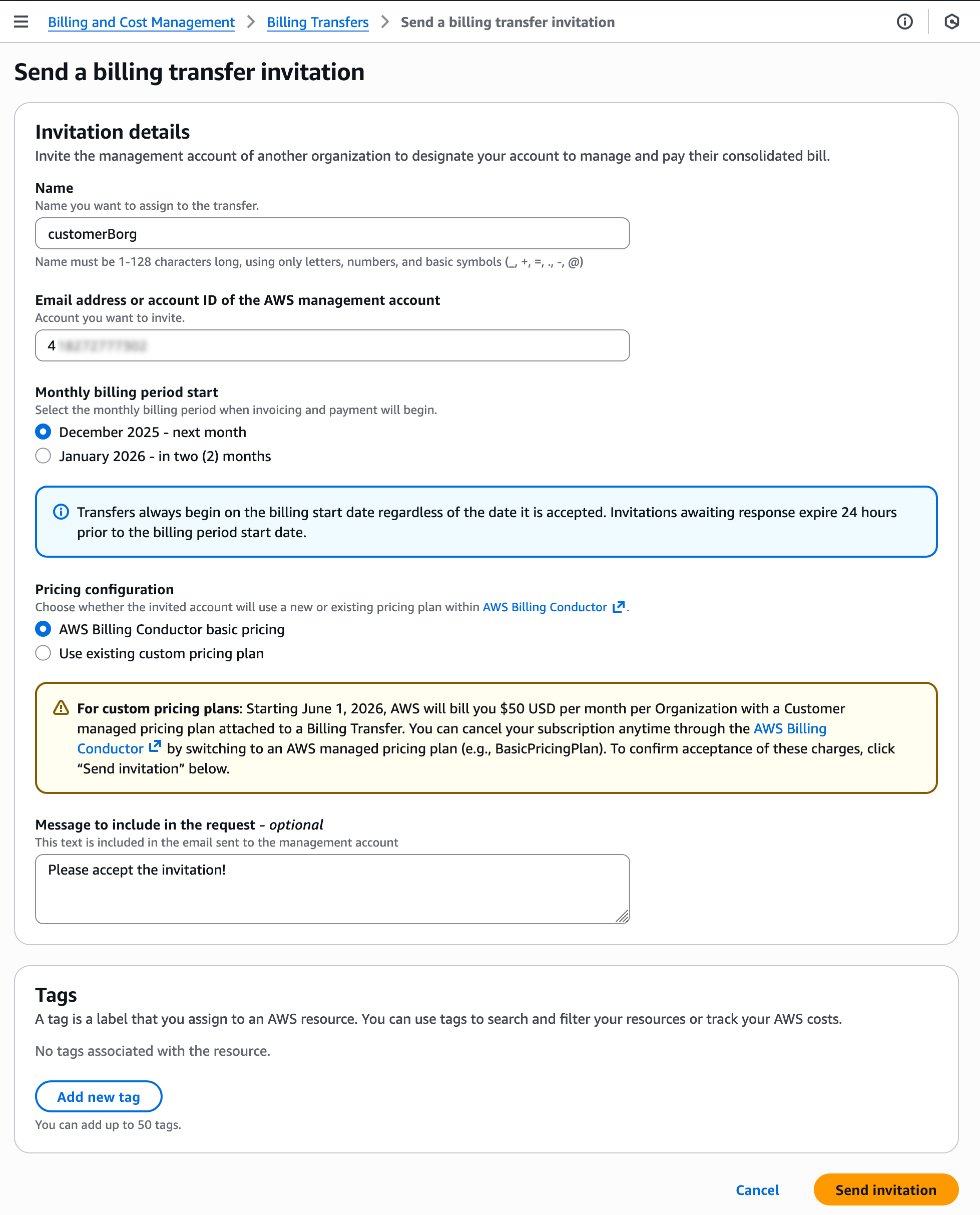 Now, you can send a billing transfer invitation by entering the email address or account ID of the bill-source accounts for which you want to manage billing. You should choose the monthly billing period for when invoicing and payment will begin and a pricing plan from AWS Billing Conductor to control the cost data visible to the bill-source accounts.