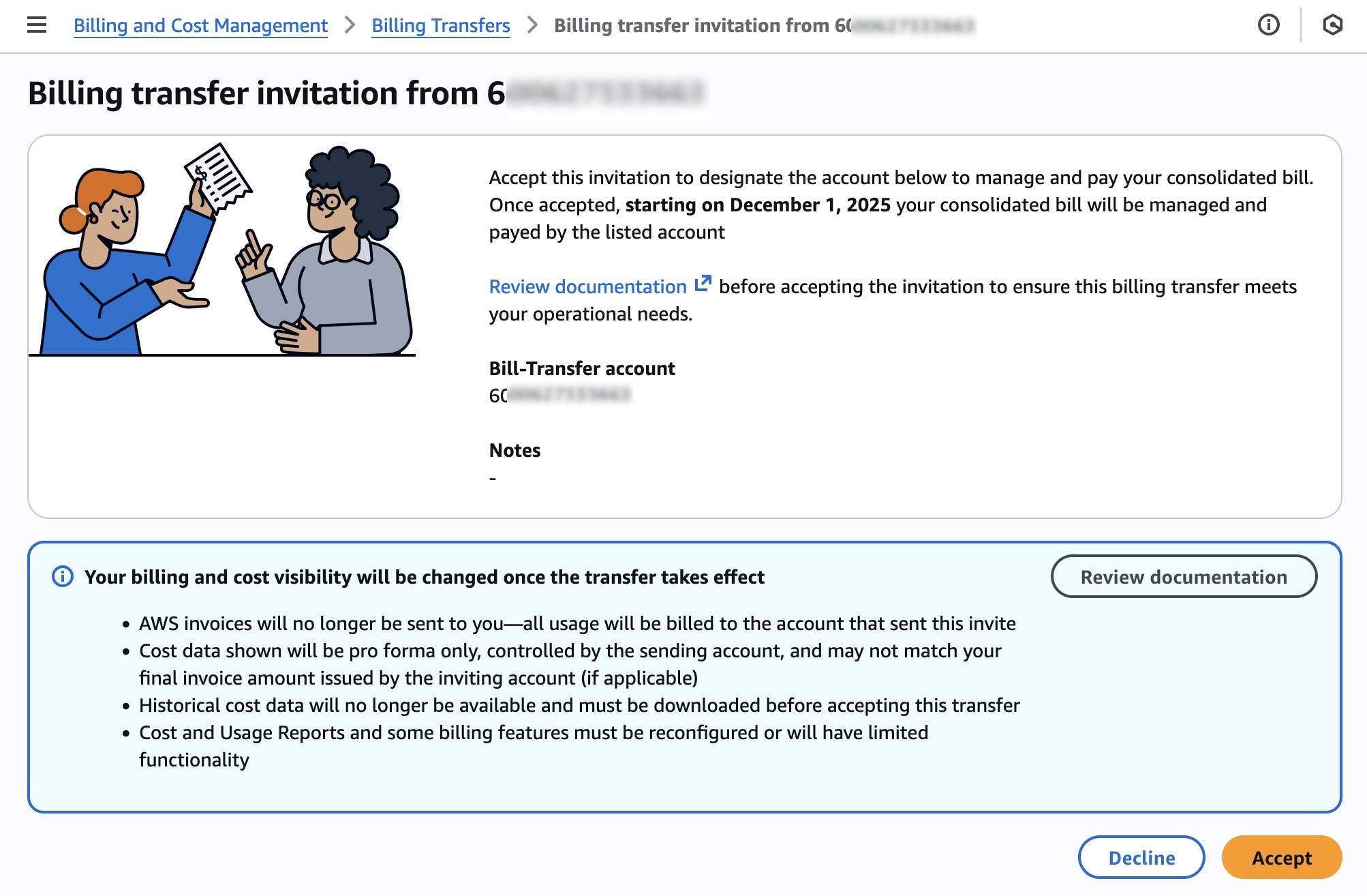 To set up Billing Transfer, an external management account sends a billing transfer invitation to a management account called a bill-source account. If accepted, the external account becomes the bill-transfer account, managing and paying for the bill-source account’s consolidated bill, starting on the date specified on the invitation.
