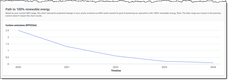 The third and final section projects how the AWS path to 100% renewable energy for our data centers will have a positive effect on my carbon emissions over time: