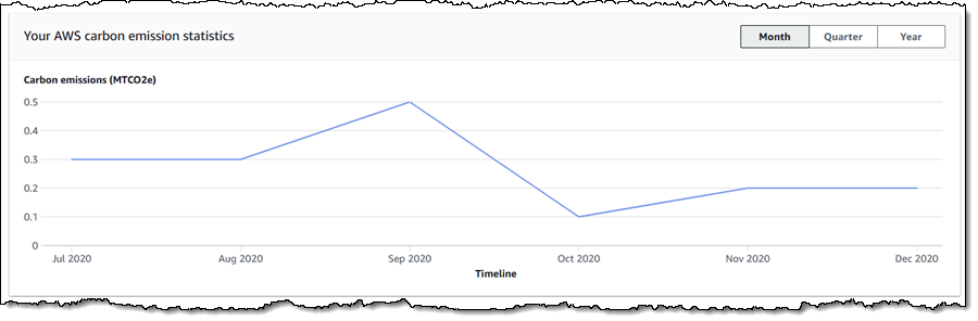 All of the values in this section reflect the selected time period. In this example (all of which is sample data), my AWS resources emit an estimated 0.3 MTCO2e from June to August of 2021. If I had run the same application in my own facilities instead of in the AWS Cloud, I would have used an additional 0.9 MTCO2e. Of this value, 0.7 MTCO2e was saved due to renewable energy purchases made by AWS, and an additional 0.2 MTCO2e was saved due to the fact that AWS uses resources more efficiently.