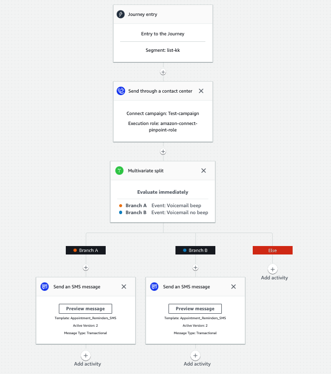 To further refine the customer experience or use multiple channels in your campaigns, for example, to send an SMS or email message to your customers when they do not answer calls, you have the option to use Amazon Pinpoint. Amazon Pinpoint is a flexible and scalable outbound and inbound marketing communications service. It allows you to define customer segments, define the customer journey, define the contact strategy, and more. Amazon Pinpoint is the system handling high-volume SMS and email campaigns.