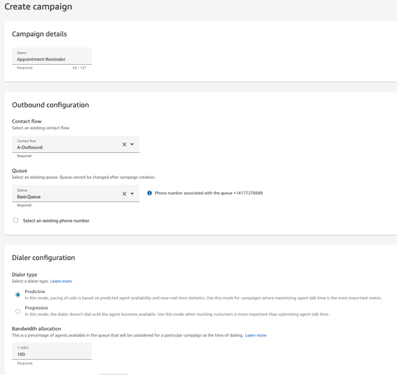 Amazon Connect outbound campaigns delivers a predictive phone dialer. The dialer includes an answering machine detection system powered by machine learning. It allows the automatic detection of answering machines for voice calls and passes calls to agents only when the call is answered by a human. The dialer also adjusts the call rate depending on factors such as percentage of human-answered the calls, call duration, and agent availability. There is no integration required to get the benefit of existing Amazon Connect features, such as automated workflows, routing, and machine learning capabilities like Contact Lens. You now have a single system for inbound and outbound communications.