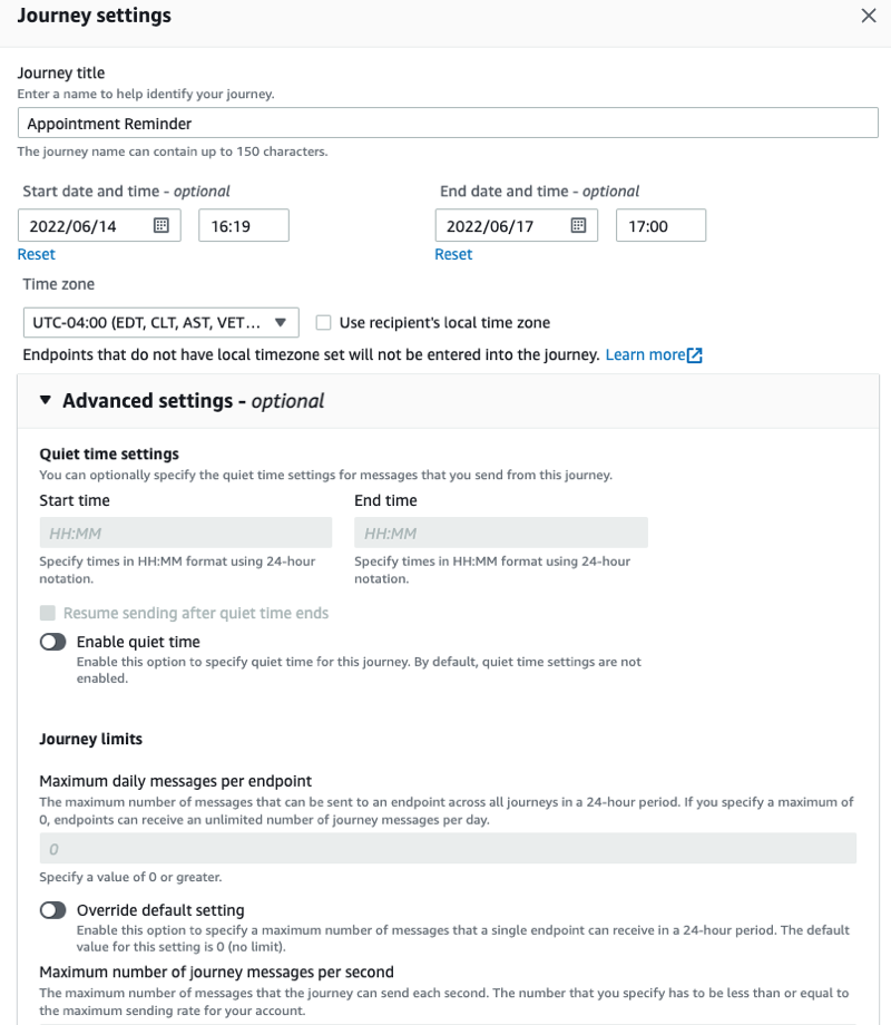 The use of quiet times allows contact center managers to configure a schedule for channel communications based on the day of the week and the hours of the day. More precise delivery times means your customers are most likely to engage with the communication and increase metrics such as open rates for SMS and email, as well as pick-up rates for voice calls. It also allows contact center managers to follow country and state-level voice dialing legislation. The following screenshot shows how you can configure quiet times using Amazon Pinpoint.