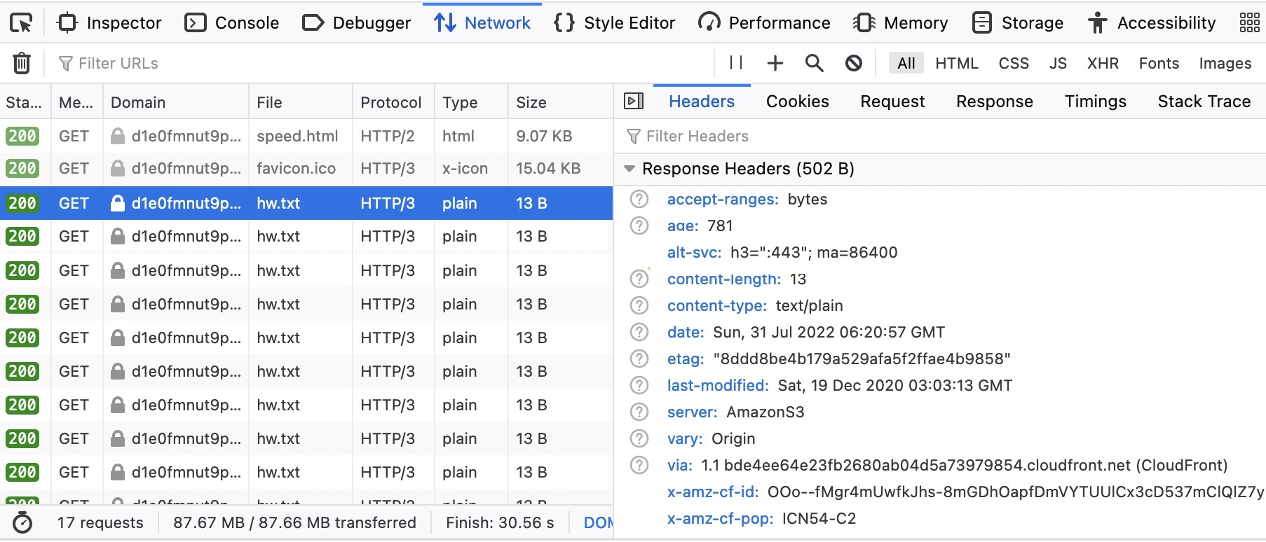 $ curl --http3 -i https://d1e0fmnut9xxxxx.cloudfront.net/speed.html